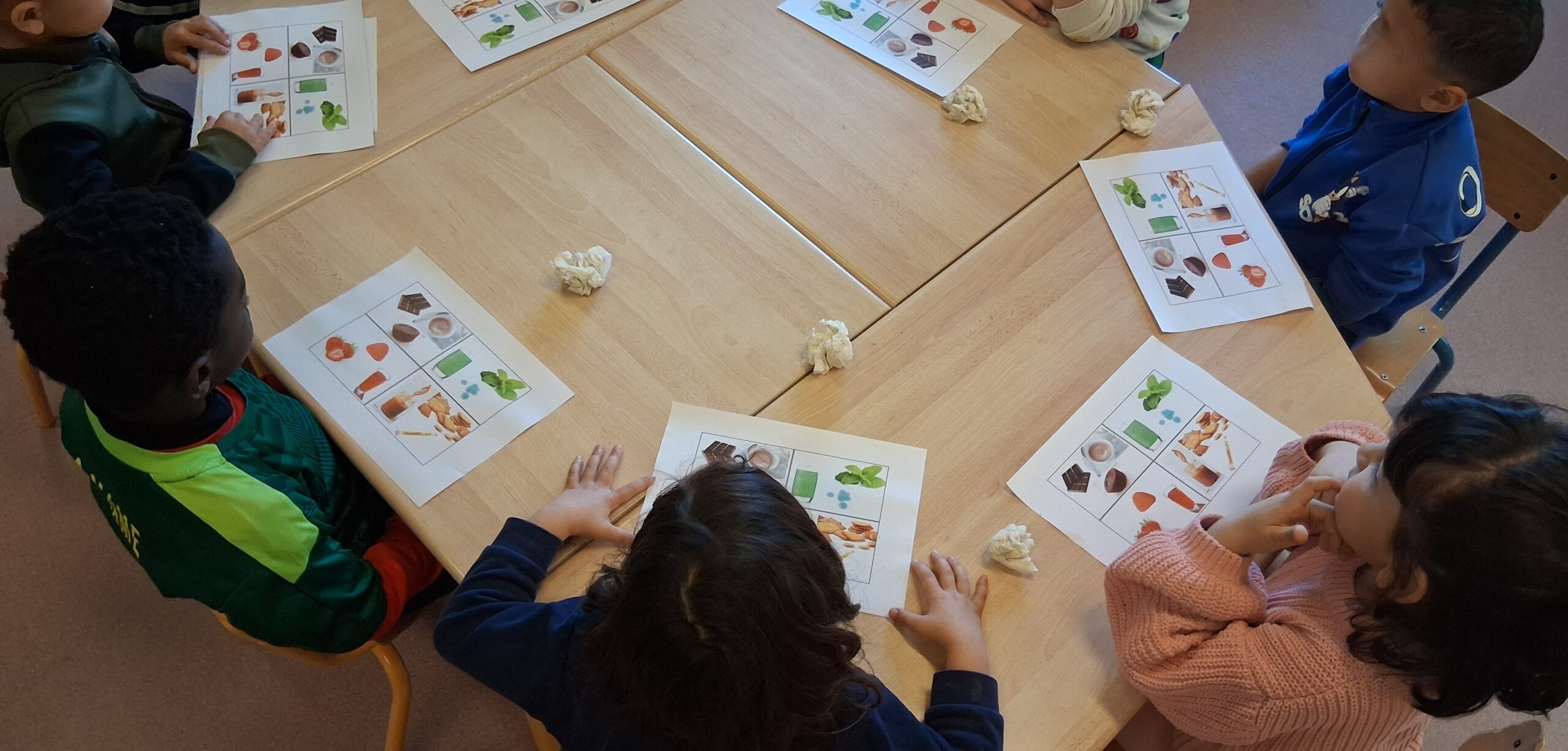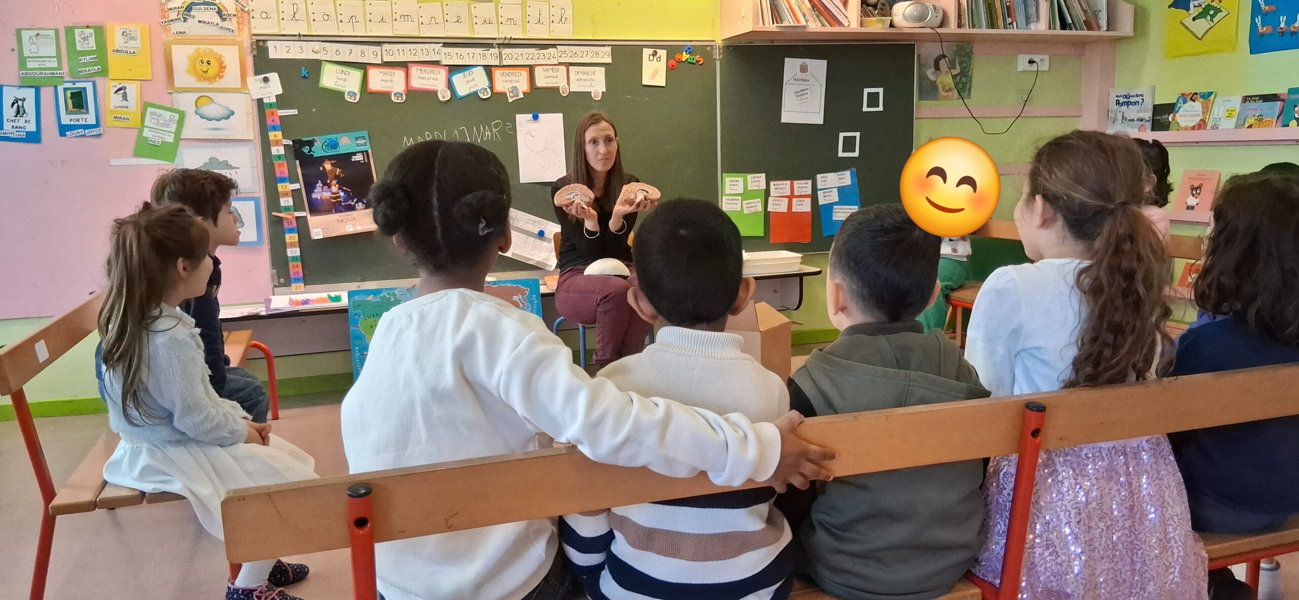 Un atelier ludique et participatif de 30 à 40 minutes a été proposé à deux classes de grande section. Les enfants découvrent leurs sens à travers trois activités : un jeu pour reconnaître les odeurs, une dégustation pour explorer les saveurs et comprendre la différence entre sentir et goûter, puis une découverte simple du cerveau.